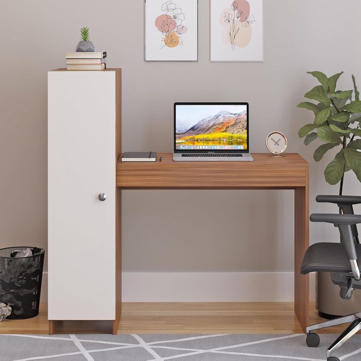 Maria Cupboard Study Table, Workstation, Computer, Laptop, WFH Office Desk, Gaming Table with Side Bookshelf Storage (Exotic Teak & White) 43/40