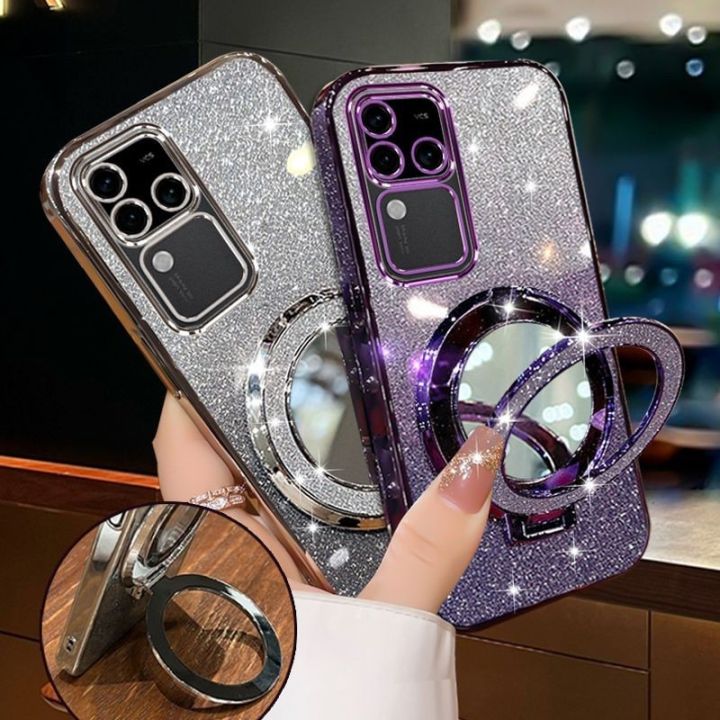 For Vivo Y100 4G / Vivo V30 Lite 4G case casing with Makeup Mirror Holder Stand Luxury Shiny Gradient Plating Glitter Slim Phone Case Clear Soft Silicone Protective Cases Pouch Women Girls