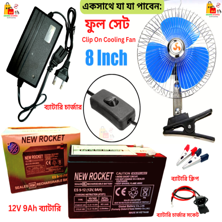 12V 9AH Battery With Dc 8" Fan With Battery Charger / New Rocket 12v 9Ah Battery + Arix DC Car Fan 8" + 12V Battery Charger + Connector = Combo Package