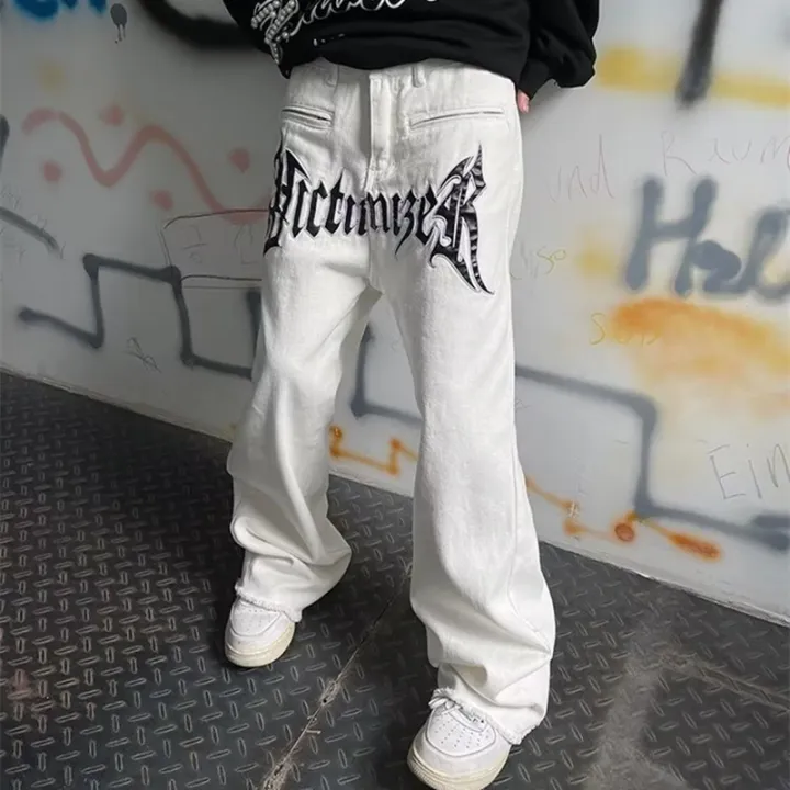 2022 Cool Design Leather Embroidery White Baggy Men Jeans Pants Y2K New Fashion Streetwear Straight Loose Hip Hop Denim Trousers