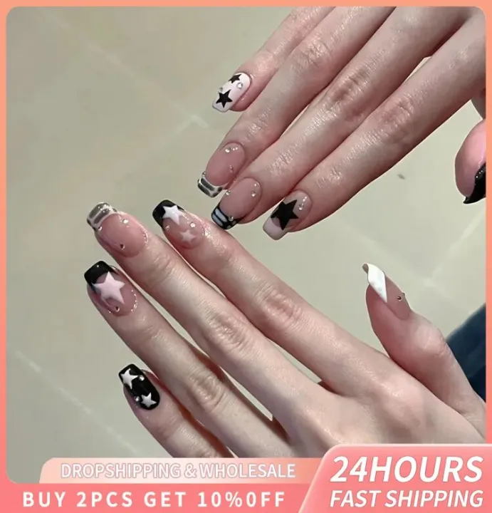 24pcs Black Pink False Nails Ballerina Wearable Nails Multiple Styles Manicure Decor Glitter Star Y2k Design Finished Nail