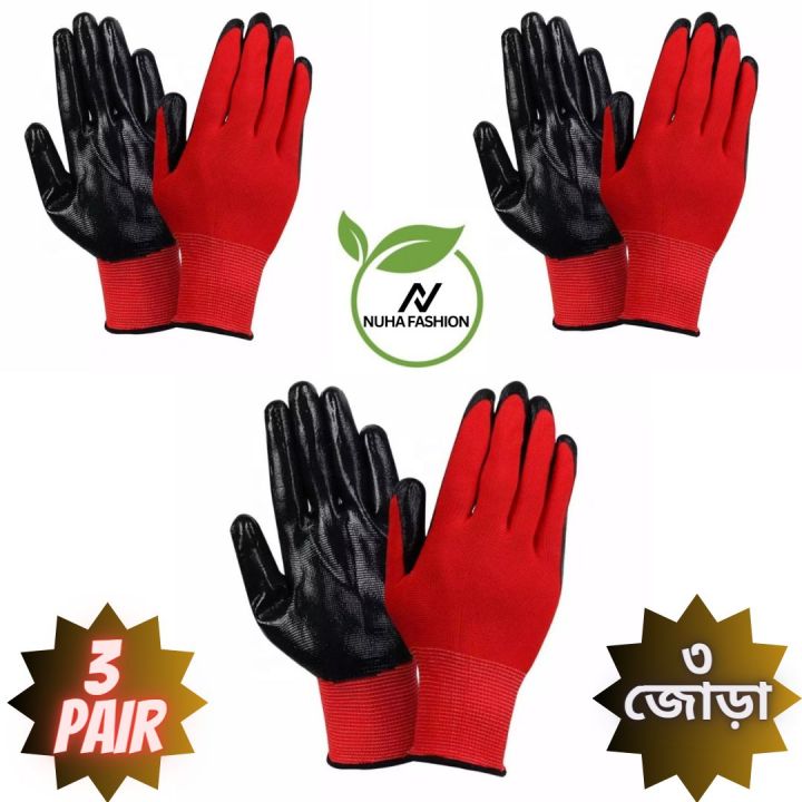 3 Pair Red Nylon China High Quality Rubber Safety Hand Gloves, Use For Construction, Household, Agriculture Work, Farm Work, Engineering Workshop, All Time Protect Your Hand Safely