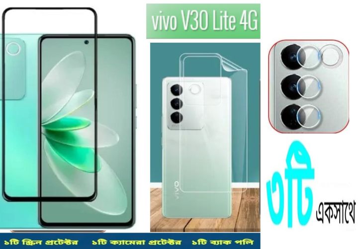 3in1 Protector Combo Pack for vivo V30 Lite 4G (5d Full Screen Protector Glass+Back Hydrogel Protector Poly+Camera Lens Protector)