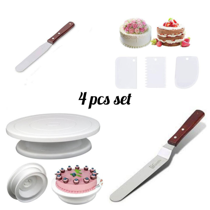 (4 পিস সেট)-কেক টার্ন টেবিল + 3 পিস স্ক্র্যাপার-প্লাস্টিক + কেক প্ল্যানার 6 "+ কেক ছুরি 6"