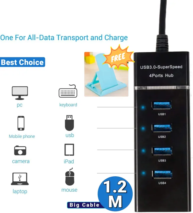 4 Port USB HUB SuperSpeed 3.0 Portable Mini-Hub "Parking Strip" For Pendrive, Mouse, Keyboards, Camera, Mobile, Tablet, PC, Laptop USB Hub Black 1.2 M