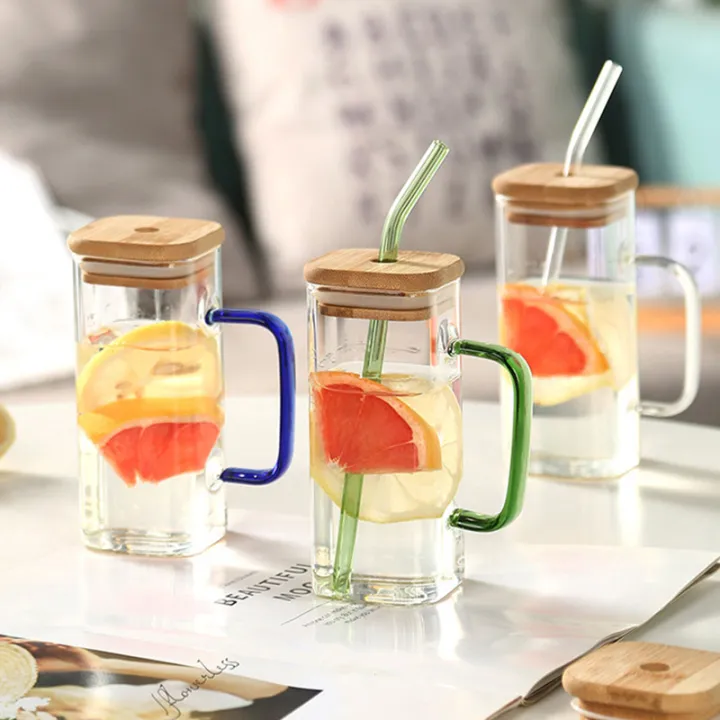 400ml High Borosilicate Mug With Lids And Straws Handle Transparent Drinking Glass Cup For Iced Coffee Juice Milk Tea Home Gift-Cola Kids
