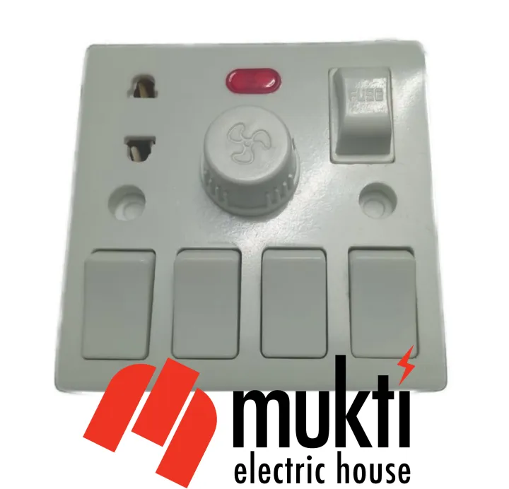 5 In 1 Four Gang Switch Fan Dimmer Regulator with 2 Pin Socket with Fuse