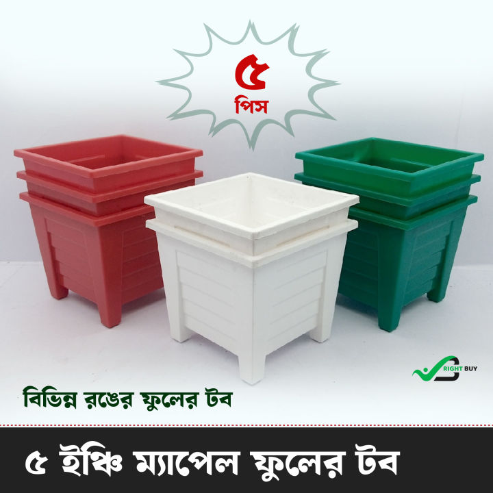 5-inch Green, Red, and White color flower tub 5 pieces. Mapela plastic flower tob / fuler tob.