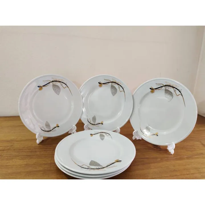6 Pcs Ceramic Dinner Plate Set 9"Inch , Flat Rice Dinner Plate, White Color Wikth print. Microwave oven save, Dining Plate Set. CD:M00