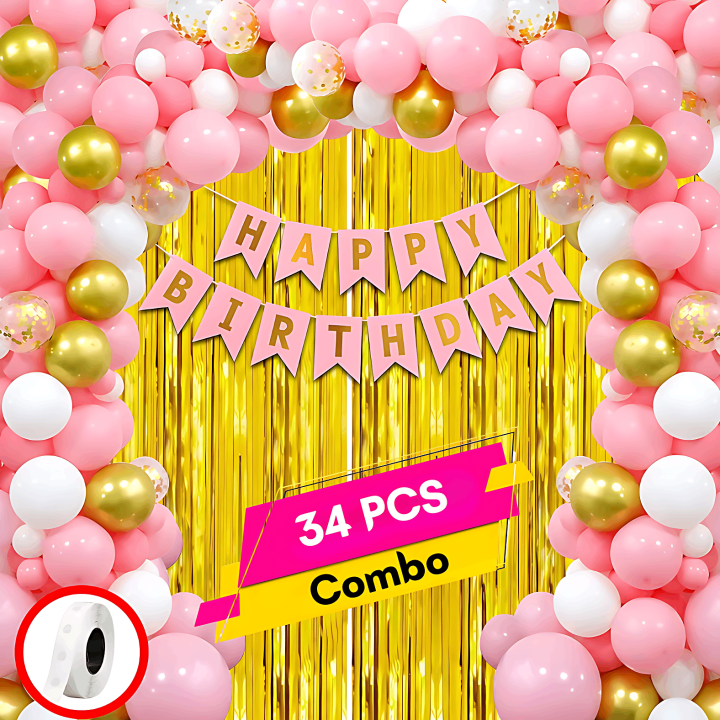 Birthday Decorations Pink Combo Set - 34-Piece Pack with Pink, Golden, and White Metallic Balloons, Birthday Pink Paper Banner, Golden Foil Curtain, and Glue Dot Roll