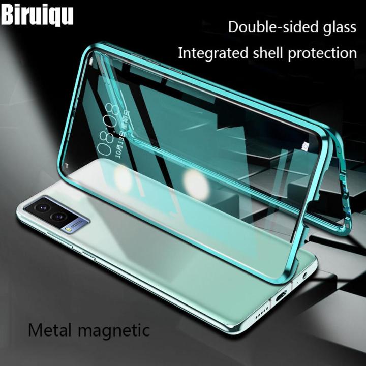 Biruiqu For VIVO V21e 5G Magnetic Absorption Case Metal Frame Shockproof Double Sided Tempered Glass Magnetic Case Cover