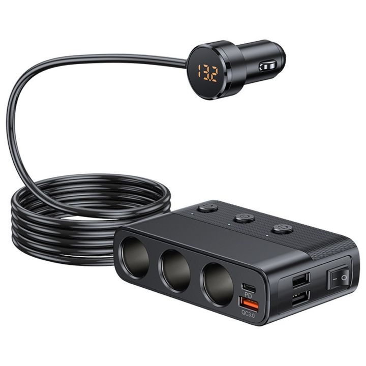 Car Chargers 128W PD+QC3.0 Quick Charging Adapter 3-Socket Power Splitter 12-24V with 4 USB Ports Volatge Display On-Off Switch for Car Truck SUV