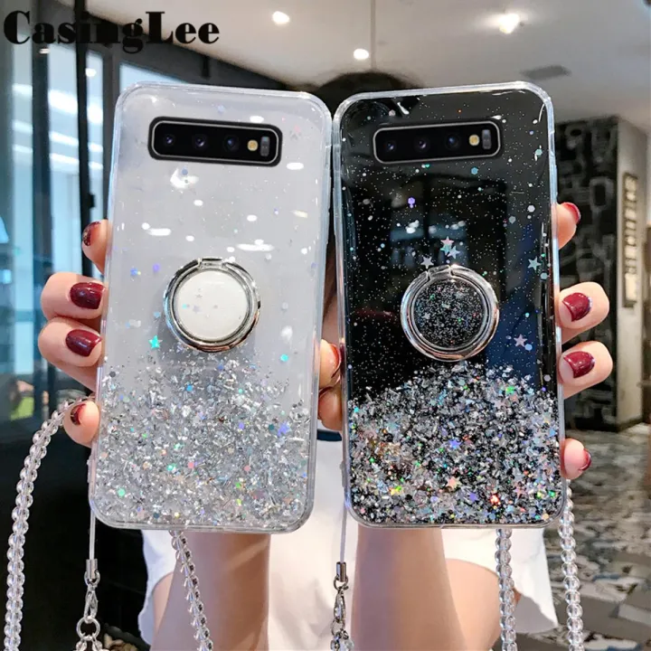 Casinglee for Samsung Galaxy S10 case Shiny Ring Glitter Soft Transparent Holder Stand Back cover with String for Samsung S10 Phone cases cover Stars Moon Girls
