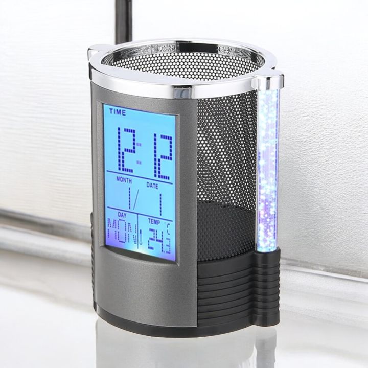"Color-Changing Bubble LED Pen Holder with Digital LCD Alarm Clock - Gift Centre Multifunctional Desk Organizer, Features Countdown Timer & Temperature Display, Durable Black/Silver Plastic, Pencil Battery Operated, Perfect for Office & Student Desks, 1 P