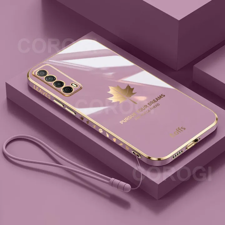 COROGI for Huawei Y7A Back Cover with Lanyard Luxury Plating Maple Leaf Stylish Fancy Case Soft Silicone Square Mobile Phone Cases Pouch for Girls Boys