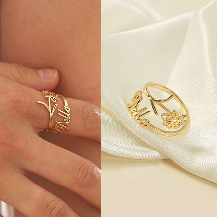 Custom Name Ring Birth Month Flower Stainless Steel Nameplate Ring Personalized Silhouette Gold Rings Women Birthday Gifts