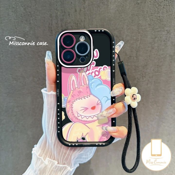 Cute Cartoon Labubu Soft Case Compatible for IPhone 11 16 15 14 13 12 Pro Max 7Plus X XR XS Max 7 8 15 6 6S 16 Plus SE 2020 Trendy Pop Mart Flower Bracelet Cover