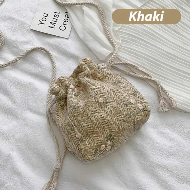 Cute Knitted Handbag Mini Purses Straw Women Lace Bucket Shoulder Bags Floral