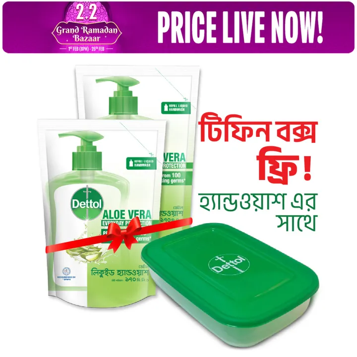 Dettol Handwash Aloe Vera Refill Double Pack (170ml x 2) Get Tiffin Box