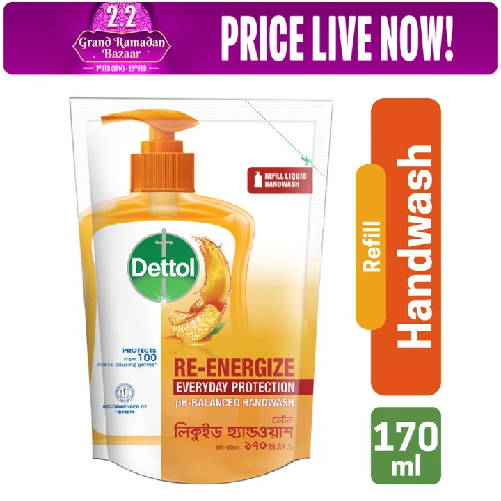 Dettol Handwash Re-energize 170ml Refill, pH-Balanced Liquid Soap formula
