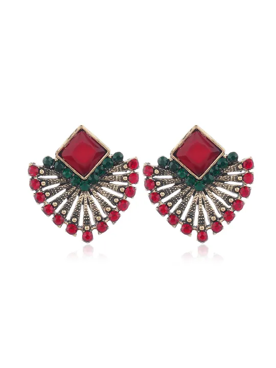 Ethnic Vintage Zircon Earrings Bohemia Fan-shaped Red Green Crystal Stud Earrings For Women New Earing Earings Jewelry Kolczyki