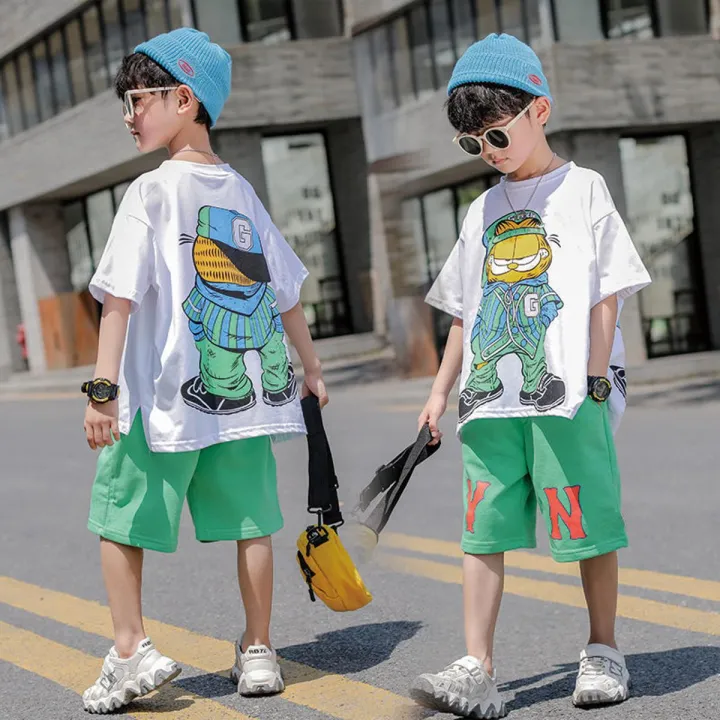 Fashion Summer Teenage Boy Clothes Boys for 4 6 8 10 12 14 Year Hiphop Korean Casual T-Shirt Shorts 2Pcs Sets Funny Cartoon Suit