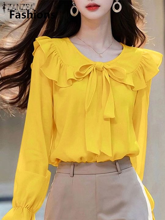 Fashions 2025 ZANZEA Peter Pan Collar Long Sleeve Blouses Korean Style Women Elegant Solid Smock Tops Sweet Long Sleeve Tie Up Blusas Mujer