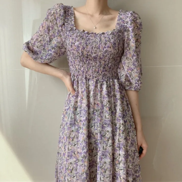【FEELLAB】2024 New Summer Super Mori French Style Retro Square Collar Puff Sleeve Chiffon Floral Dress