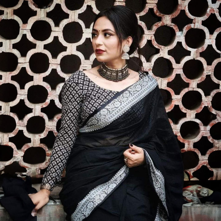 Half Silk Cotton Saree For Women - Black and Silver Color - Comfortable to wear- Perefct For All Seasons and Occasions