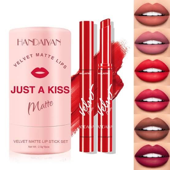 HANDAIYAN 8 Colors Velvet Matte Lip Stick Set Just A Kiss Lipstick Long Lating Waterproof Non-stick Cup Lipgloss Red Lips Lip Liner Makeup
