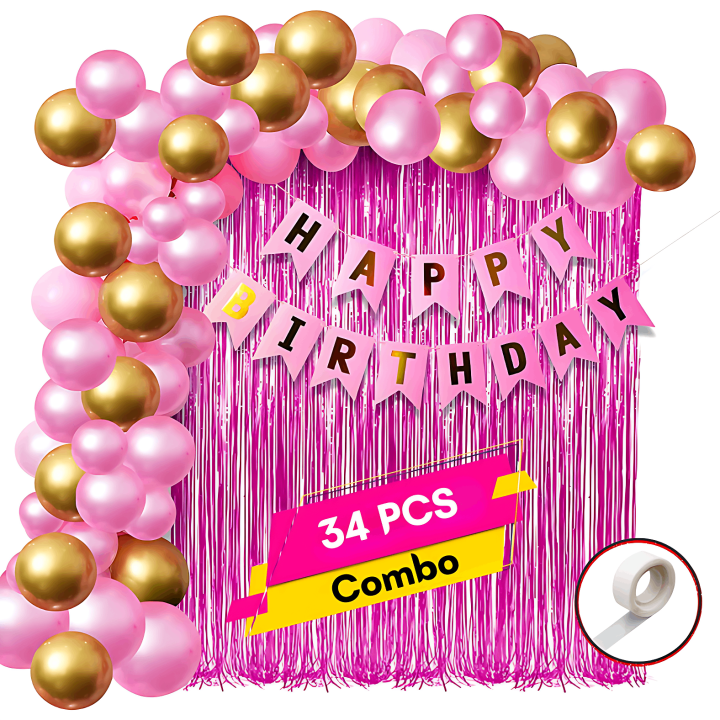 Happy Birthday Decorations Pink Combo Set - Metallic Balloons, Birthday Banner, Foil Curtain, and Glue Dot Roll - 34 Pieces of Party Perfection