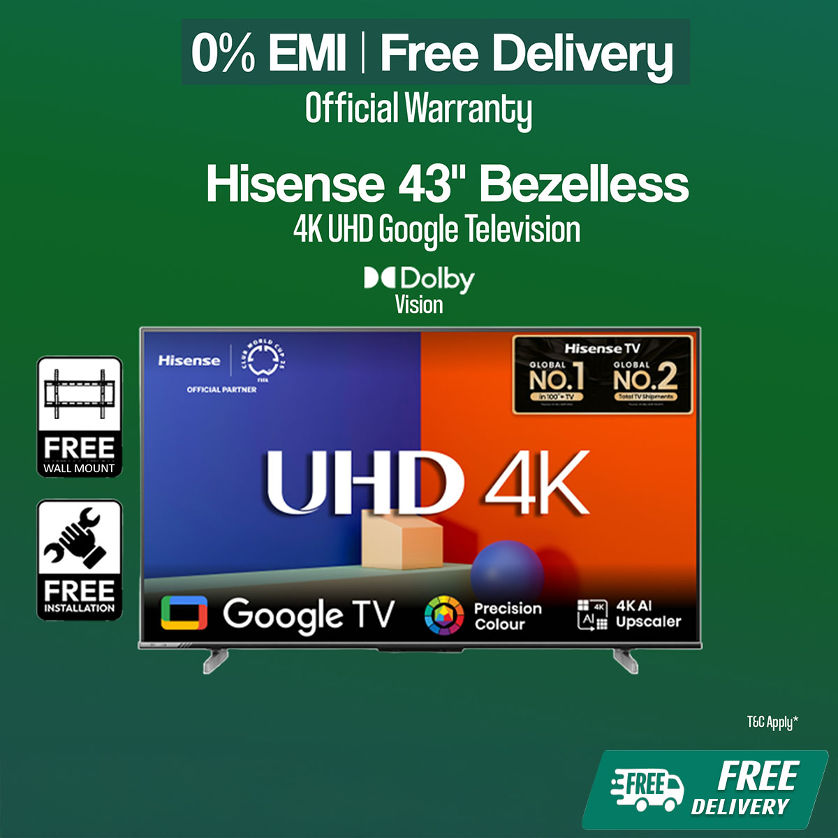 Hisense 43 inch Bezelless Dolby Vision 4K UHD Smart LED Voice Control Google DTS TV 43A6F3 with Free Delivery