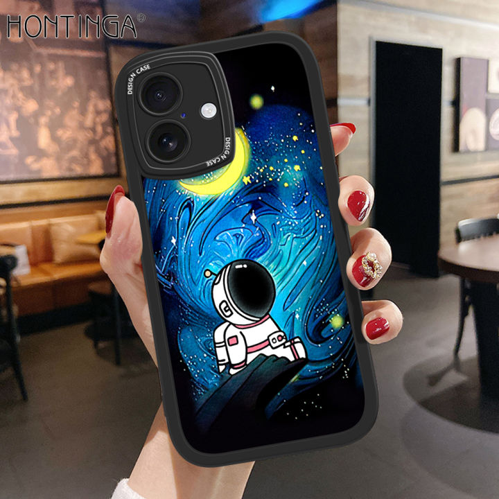 Hontinga for iPhone 16 Pro Max 16 Plus Back Cover PU Leather Moon Astronaut Phone Case Soft Silicone Edge Mobile Cover