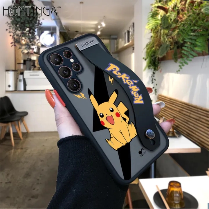 Hontinga for Samsung S22 Ultra 5G Back Cover With Wristband Cartoon Pikachu Phone Casee Full Lens Protection Thin Frosted Cases