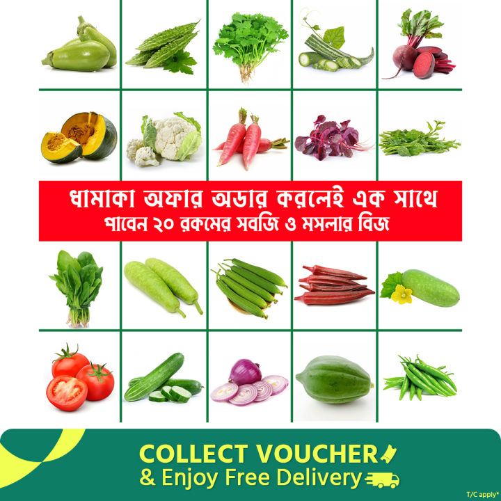২০ ধরণের সবজি ও মসলার কম্বো প্যাক বীজ (ধনিয়া,শসা,কুমড়া,লাউ,টমেটো,করলা,বেগুন,মুলা,বীটরুট,লালশাক,পুঁইশাক,পালংশাক,পেঁপে,পিঁয়াজ,মরিচ,জালিকুমড়া,ফুলকপি,ঢেড়স,চিচিঙ্গা,ধুন্দল)