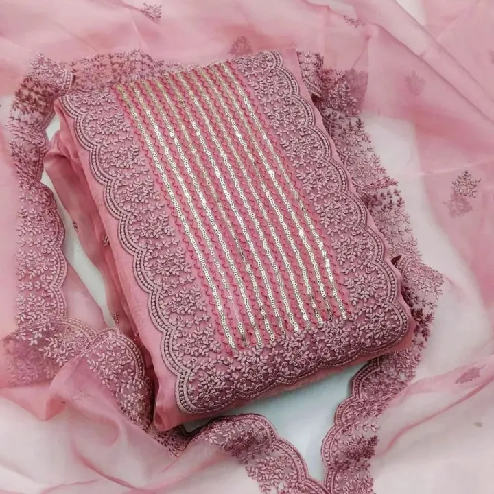 Indian Unstitched Organza Tissue Shalwar Kameez 4 Piece Party Dress for Women Embroidered