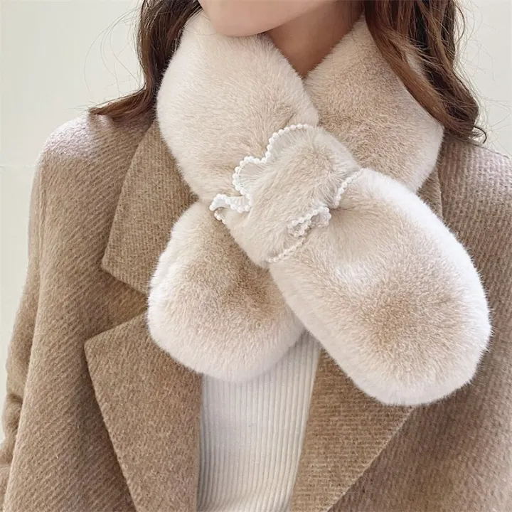 Korean Women Faux Rabbit Fur Collar Pearl Lace Cross Plush Scarf Female Winter Double Sided Thick Neck Protection Warm Shawl T36
