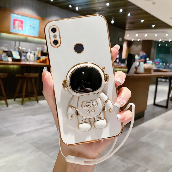 Maitus for Xiaomi Redmi Note 5/Note 5 Pro Back Cover with Lanyard + Cute Astronaut Folding Stand Luxury 6D Plating Shiny Phone Case Soft Silicone Square Bumper Mobile Cases for Boy Girls