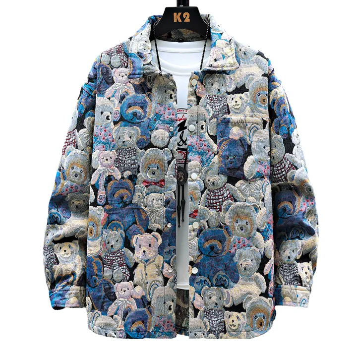 Men Teddy Bear 3/4 Sleeve Jacket Fashion Animal Pattern Coat Jacquard Woven Top Outerwear