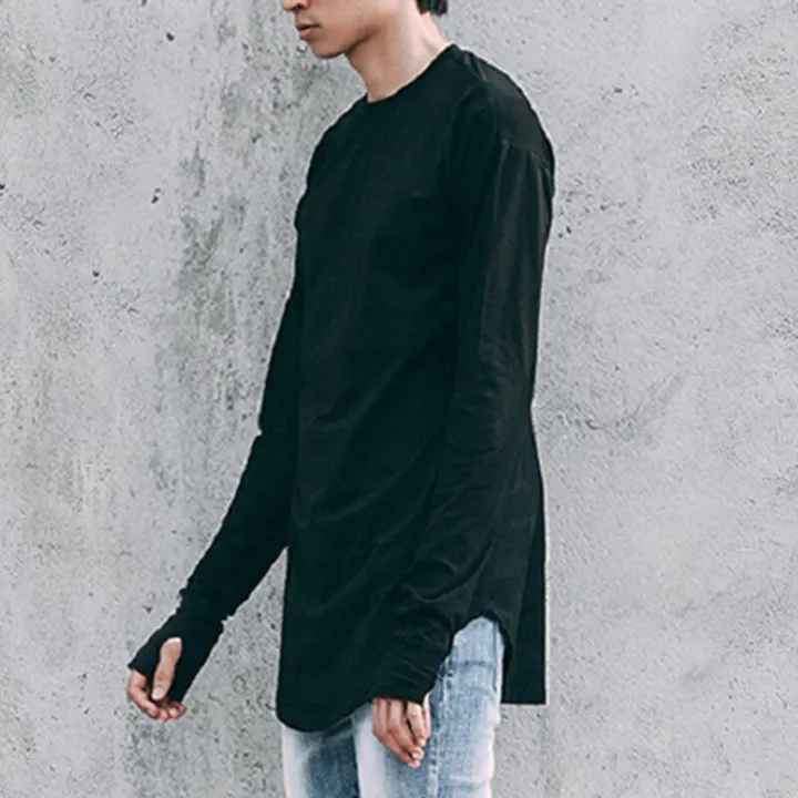 Men's Thumb Hole Tshirt Solid Color Streetwear Men Long Sleeve T-shirt Casual Round Neck Male Tops Funny Curve Hem T Shirt Cloth