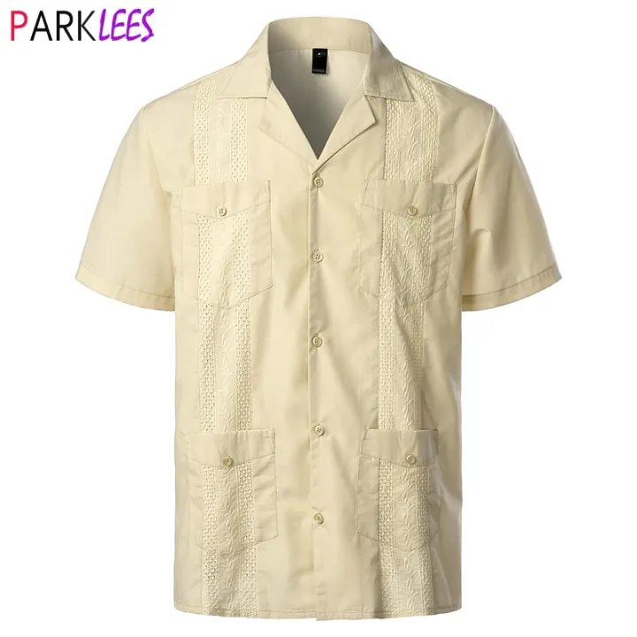 Men's Traditional Cuban Camp Collar Guayabera Shirt Short Sleeve Embroidered Mexican Caribbean Style Beach Shirt with 4 Pocket
