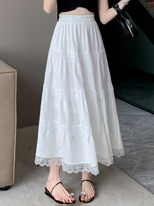 Midi Long Skirt Women White Skirt 2024 Mori Girl Style Sweet Crochet Lace Spring Summer High Waisted A-Line Pleated Skirts rok