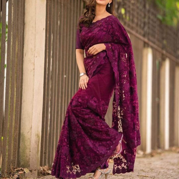 New Exclusive Indian Vichitra Silk Saree - High Quality - Embroidery Work On Blouse - sari - শাড়ি -Comfortable shari for women