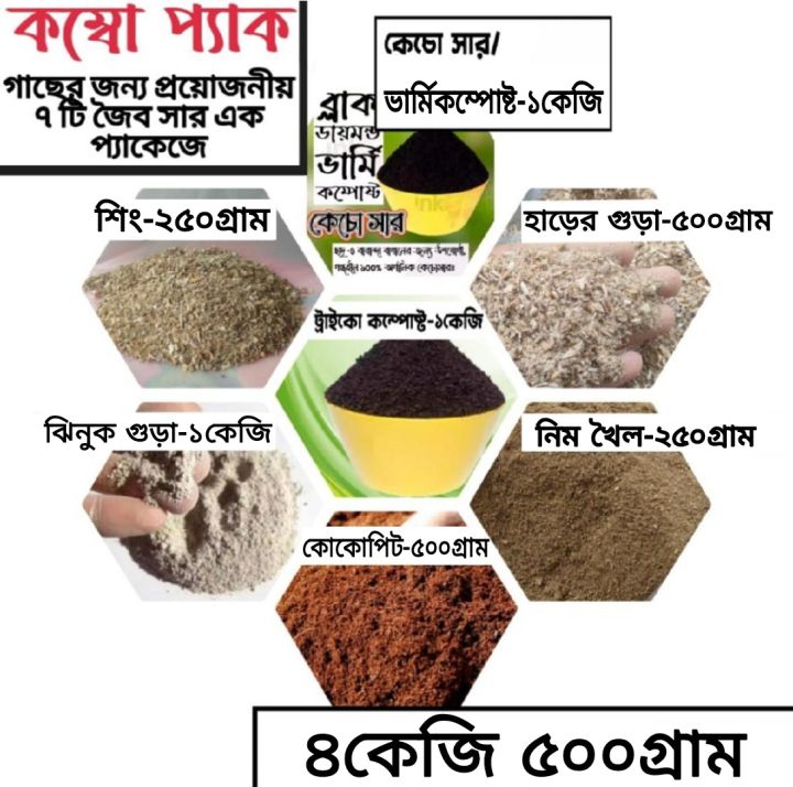 Organic Fertilizer 7 in 1 Combo Pack( Vermicompost +Bone meal+Horn Meal+Neem Cake+Tricho compost+Cocopeat+Jhinuk(Shamuk))