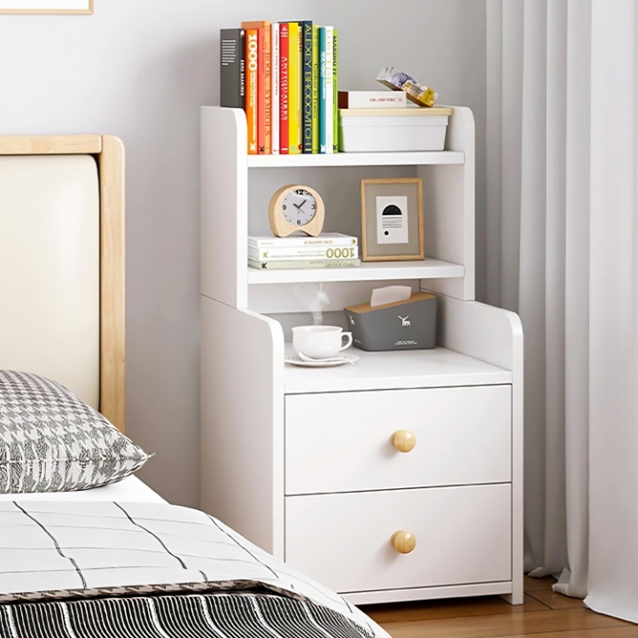 Royal Decor M15 MDF Exclusive Bed Side Table or Nightstand for Bedroom, Simple Storage Cabinet With Drawers and Shelves, Beech-White Finish
