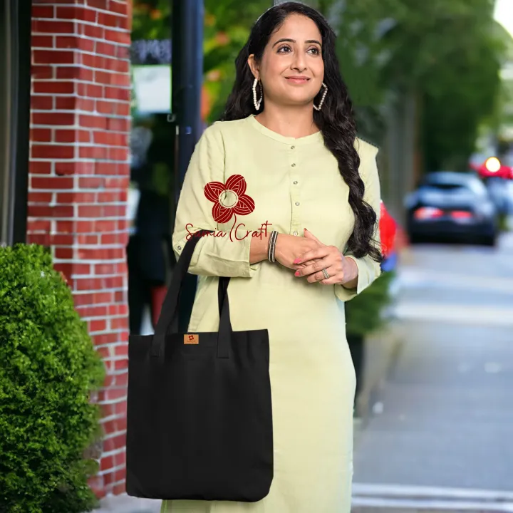 Samia Crafts 13/14Inc Fashionable Top Handle Simple Plain Solid Black Color Canvas Tote Bag with Zipper Best Fabric & Shopping Bag For Everyday Daily Use - Durability Assurance