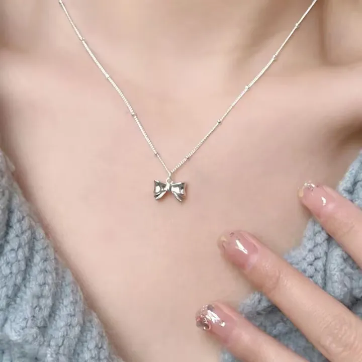Silver Color Smooth Bow Pendant Necklace Women's Collar Chain Minimalist Neck Chain Birthday Gift Light Luxury Jewelry Qoddess