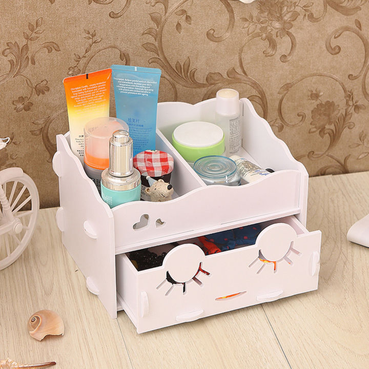 Smiling face wooden white cosmetics organizer, clean desk and desk