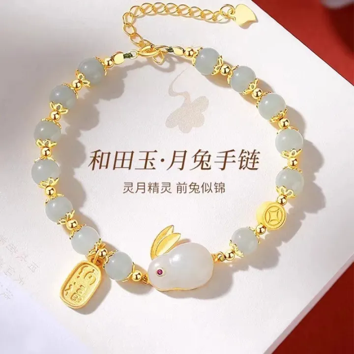 Sterling silver jade rabbit and Tian jade bracelet Chinese moon rabbit bracelet bracelet light luxury niche design for girlfriend birthday gift