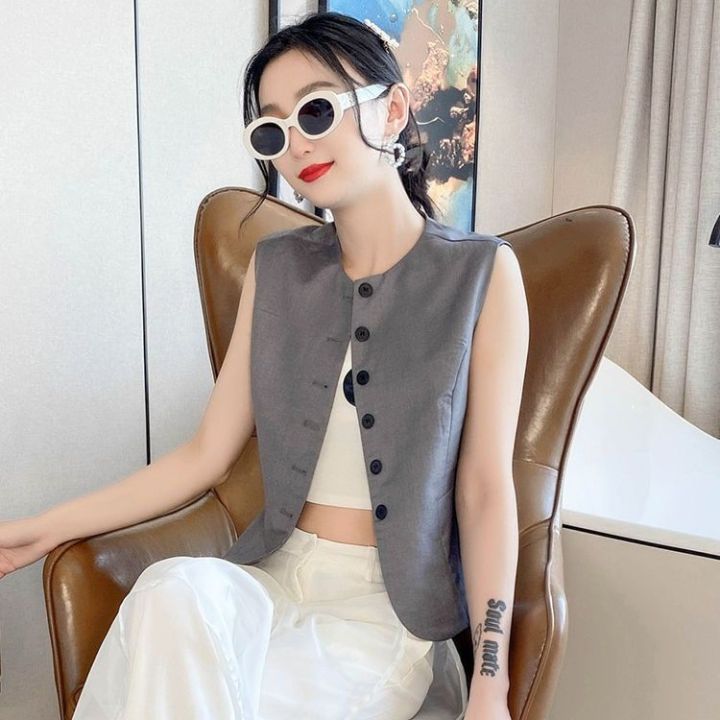 Summer Waistcoat Suit Vest Women's Single-Breasted round Neck Design Sense Niche Short Fashion All-Match Vest Waistcoat Fashion